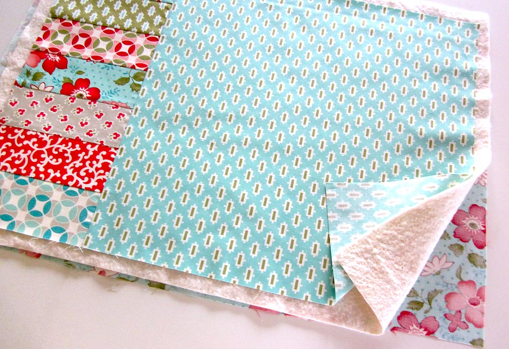 - Place the placemat back right side DOWN on your work surface. Layer the batting on top of the back. Layer the completed placemat top right side UP on top of the batting. The backing and batting are cut slightly oversized to allow a bit of extra room for quilting.
