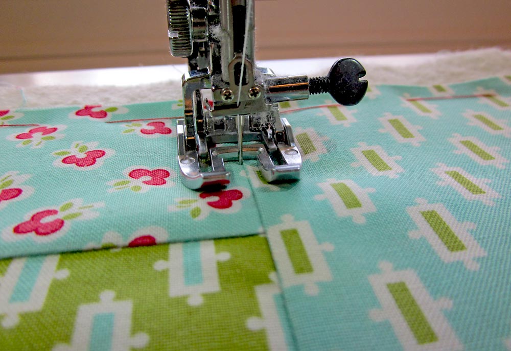 - If possible, attach an Even Fee/Walking foot to your machine or engage your your machine’s built-in fabric feed system. It will make working with the layers easier. Stitch in the ditch (which means stitching along your previously sewn seam line) between the strata strip and the main front rectangle of fabric.