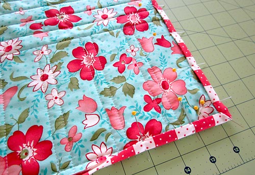 - Bring the binding up and over to the back side of the placemat, covering the line of stitching. Press in place and pin as needed. Don’t be afraid to use lots of pins.