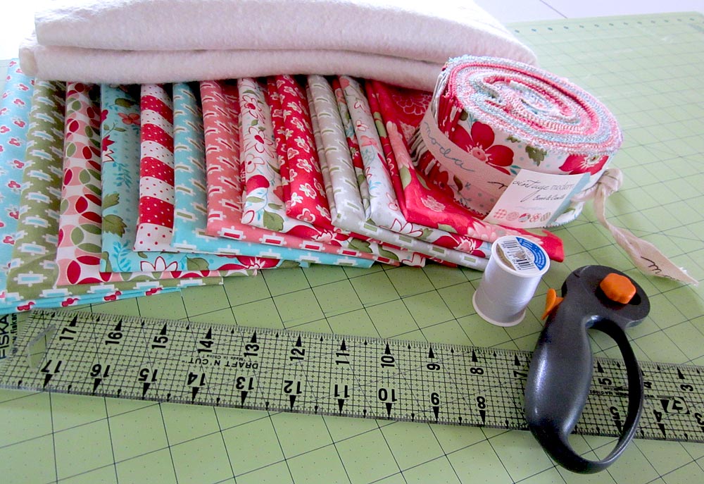 NOTE: You could certainly use fewer cuts, but the beauty of this collection is how marvelously it all mixes and matches, so we have given you the information below for how to built our set. - 1 yard of 45″ wide lightweight, low loft batting: we used Warm & Natural quilt batting