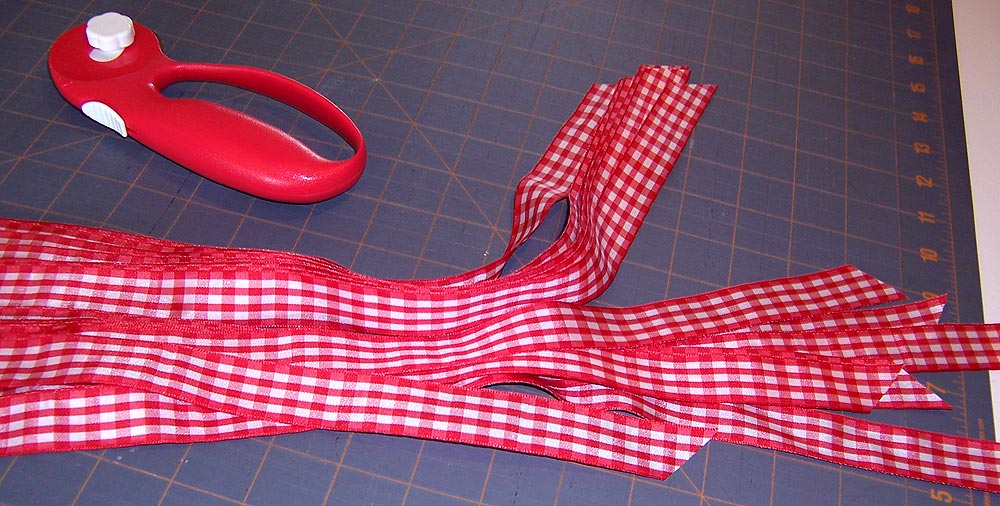 - Cut the ribbon into eighteen 18″ lengths. Trim the ends at a diagonal. Each curtain panel uses eight ties, the two extra ribbons are to use as tie backs.