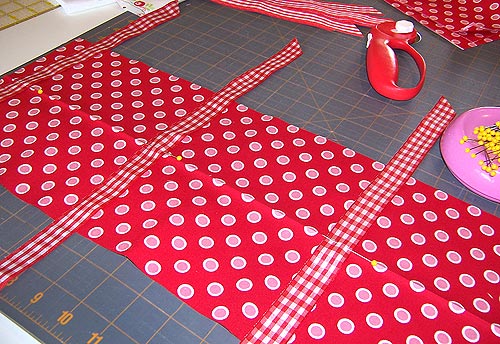 - Collect eight ribbon lengths. Fold each length in half to find its center point. Place the center line of the ribbon on the center crease line of the accent strip. The ribbons will lay perpendicular to the fabric. Space the eight ribbons evenly along the strip with the first and last ribbons ½” in from each end. Our ties were approximately 6″ apart. Pin in place at the center points.