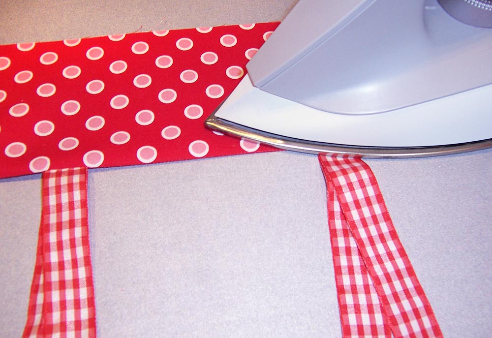 - Fold the accent strip in half again, wrong sides together, along the crease line and press the ties up and away from the strip. Your seams will run along the very top fold of the accent fabric but will be hidden between the ribbons.