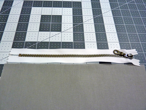 - Place the zipper unit right side down (zipper teeth down). Center the top edge of the zipper tape side to side across the top of the panel. The tabs will extend beyond the panel to either side. The zipper should be open about half way.