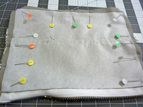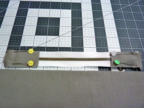 - Pin the layers together along the edge of the zipper.