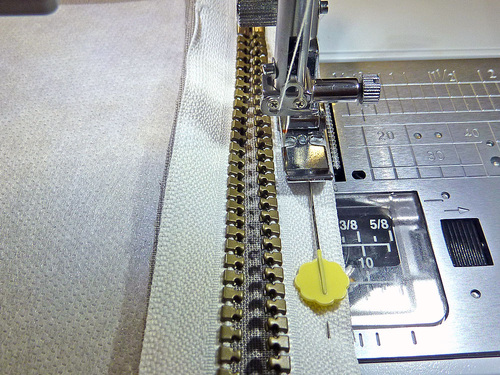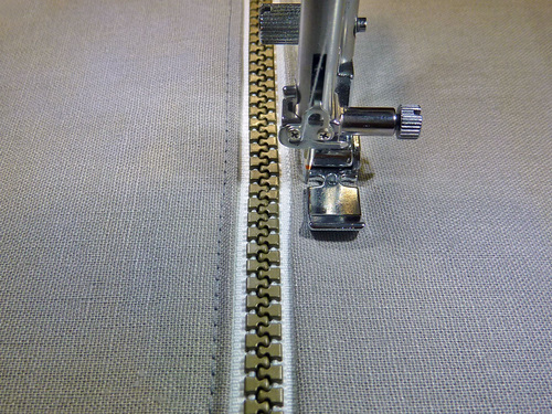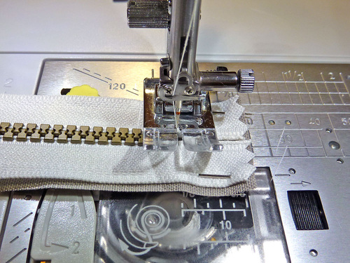 - Attach your Zipper foot. Stitch the zipper to the fabric panel, running the seam about ⅛” from the zipper teeth.