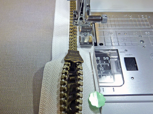 - When you can start to feel you’re approaching the zipper pull, stop with your needle in the down position.