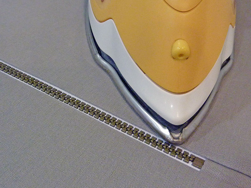 - Press the two panels away from the zipper. You now have panels stitched in place on either side of the zipper and the excess width is neatly filled in with the zipper tabs.