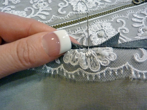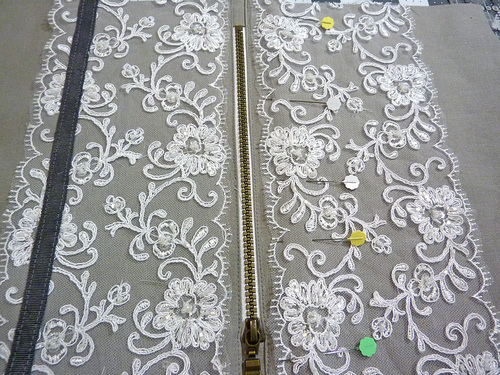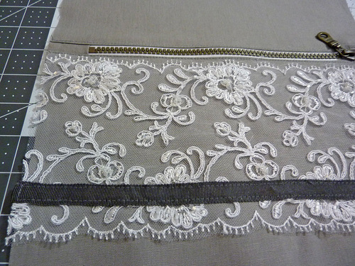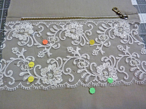 - The lace panel should be positioned so its top edge is just below the topstitching along the zipper. The sides of the lace panel are flush with the fabric panel. Pin the lace in place.