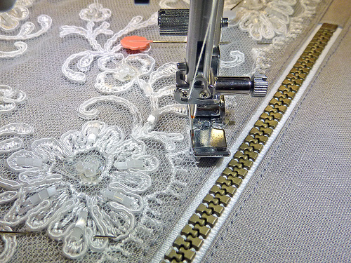 - Still using a Zipper foot for the best maneuverability, stitch along the top edge of the lace, following its finished edge. Our lace had a scalloped edge we followed. Stitch only along the top. The sides and bottom edge of the lace are not stitched.