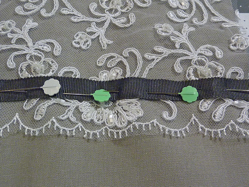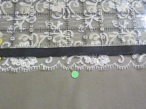 - Edgestitch the ribbon in place along both long sides and across both ends. This stitching is what holds the bottom of the lace panel in place. The very bottom edge of the lace panel is still free.