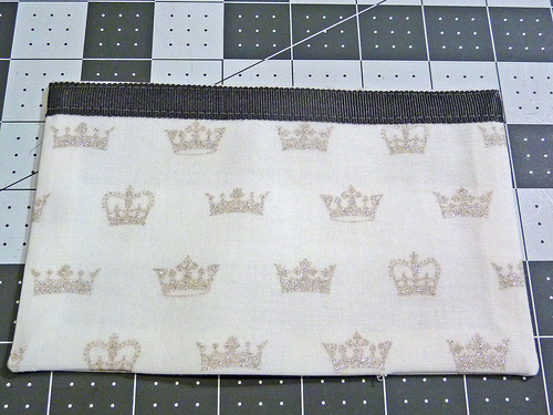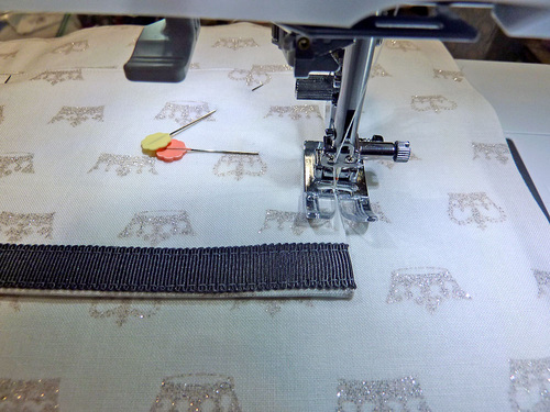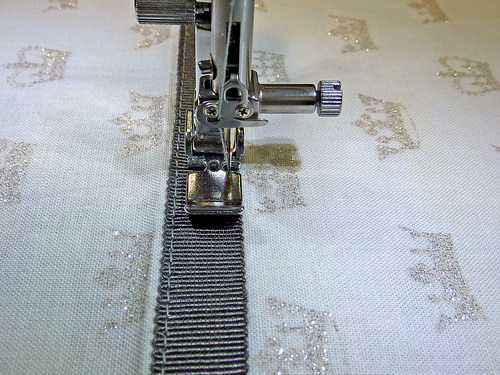 - Edgestitch the ribbon in place along both 7½” sides. We switched back to our Zipper foot.