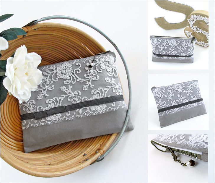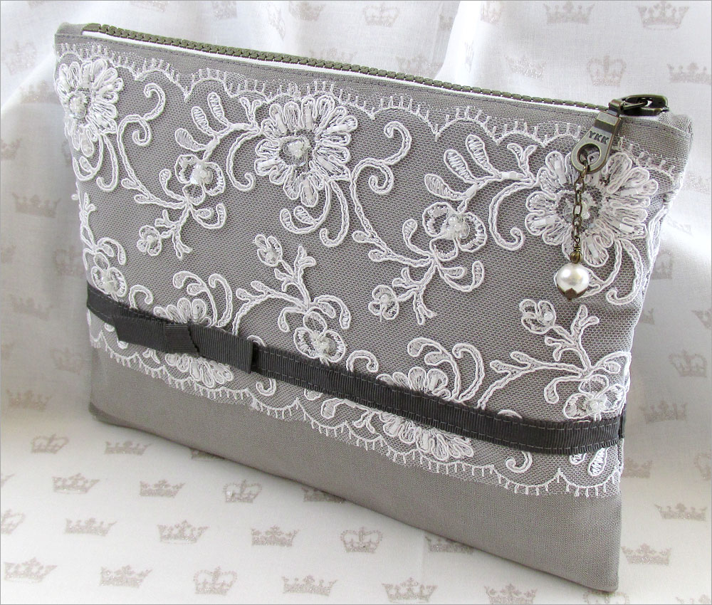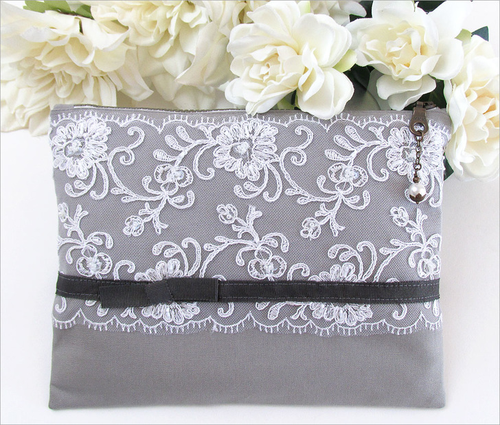 This elegant clutch blends a natural warm gray linen with 22” of gorgeous lace. The smooth linen peeks through the lace overlay for a lovely textured combination. Our bridal lace scrap featured sequins and seed beads integrated into the motif for a bit of extra sparkle. For the best look and to avoid any hemming, choose a lace that is finished on both sides.