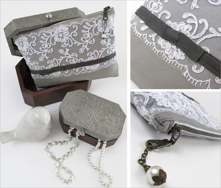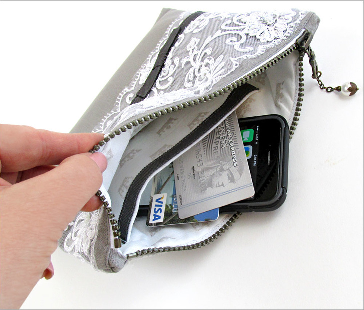 For an extra fancy finish, we created our own zipper pull, recycling the pearl drop from a broken earring!