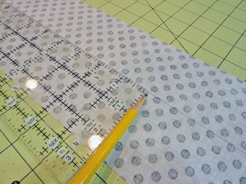 - Working from the left side, measure 5½” to the right and draw a vertical line. From this line, measure 15″ to the right and draw a second vertical line. From this second line, measure 7″ to the right and draw a third vertical line. There should be 18½” remaining from the third vertical line to right raw edge.