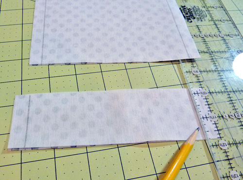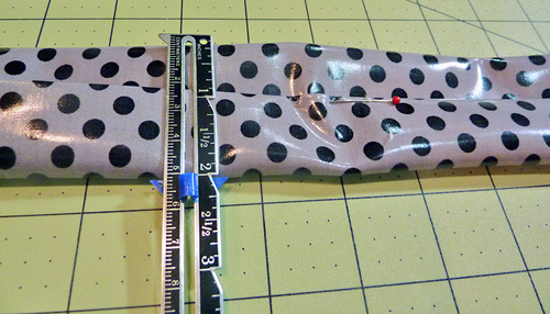 - On each strap (front and back), measure 2½” down from the top raw edge of the bag panel and draw a horizontal line or place a pin or clip.