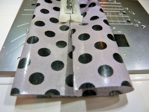 NOTE: We are using a Janome Ultra Glide foot. As we mention in our laminates tutorial, if you don’t have a Teflon® type foot, you can use wax or parchment paper between the presser foot and laminate. - Topstitch approximately ¼” from the folded back seam across the pocket base