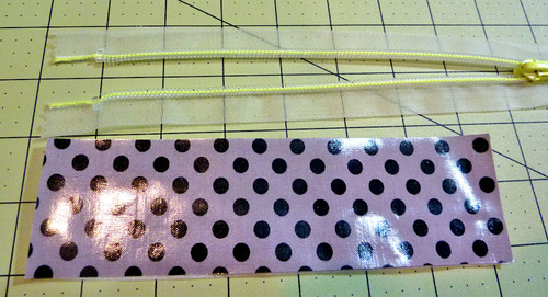 - From the fold over elastic, cut ONE 5″ length for the bottle pocket and ONE 42″ length for the lining pocket.
