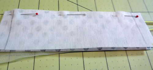 - Place the elastic across the top of the panel, aligning the horizontal center line of the elastic with the top raw edge of the fabric. Match up the center points of the fabric and the elastic.