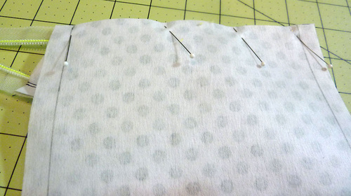 - Find the interfaced pocket top and pocket base pieces and the zipper. On each of the pocket pieces, draw a vertical line ½” in from both side edges. This mark is where the handles will overlap the pocket. The zipper should be centered between these marks – the zipper pull at one mark, the zipper stop at the other.