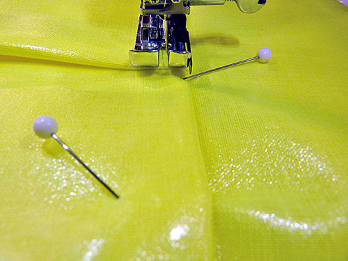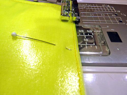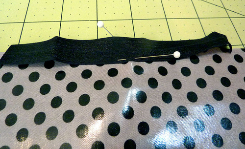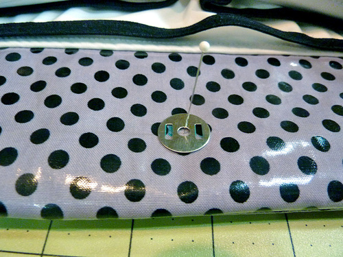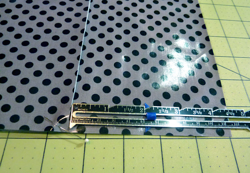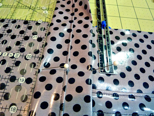 NOTE: You will notice we used regular straight pins throughout rather than the traditionally-recommended clips for laminate. We were not worried about our finished product being 100% water-tight (like you might be for something like diaper covers). In addition, we were able to keep the majority of our pins within the seam allowances so any holes didn’t affect the body of the bag.