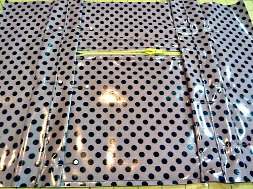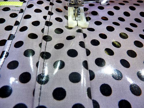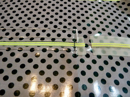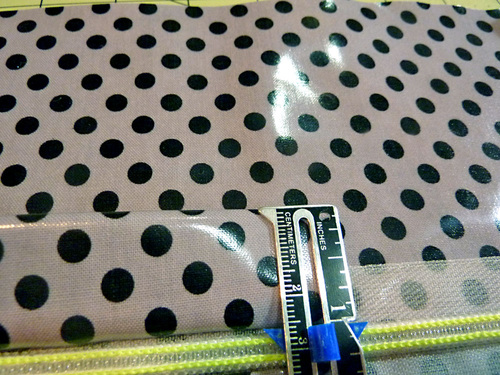 NOTE: Because we had a longer zipper, we actually opened out zipper and moved the bottom half of our zipper completely out of the way. You’ll also notice our interfacing is pulling away a bit from the laminate. As mentioned above, that’s okay if it happens as all the raw edges of the various pieces will be secured within seams during construction.