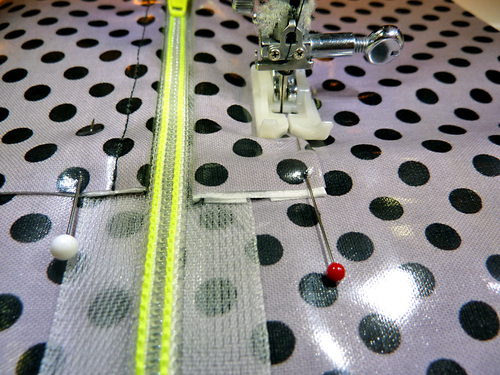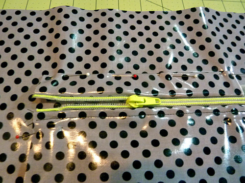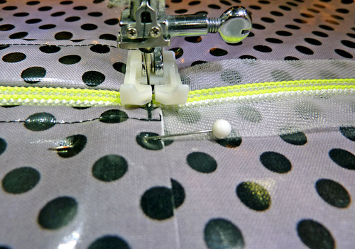 - Stitch the top edge of the zipper to the pocket top laminate piece, staying as close to the zipper teeth as the foot will allow, removing the pins as you sew.