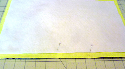 - Find the 16″ x 11″ lining piece, which is the bottom insert sleeve. Fold it in half so it now measures 16″ x 5½”. Pin in place along one end and the long side.
