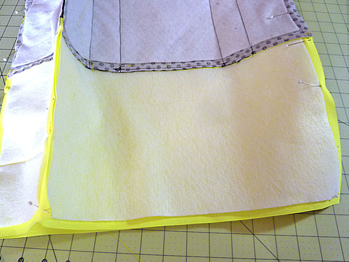 - Fold the lining in half and pin along the remaining side, matching up the raw edges of all the layers and aligning the horizontal facing seams.