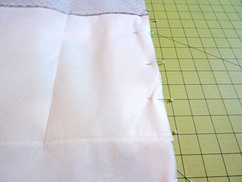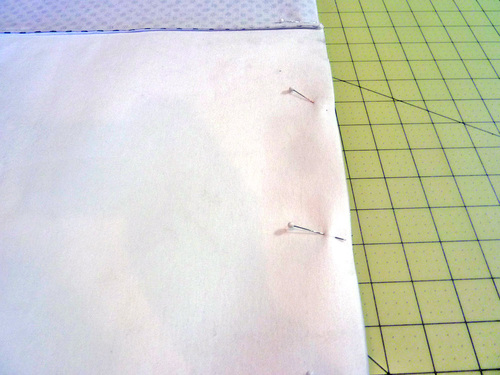 - Place the bag on your work surface. It is wrong side out. Flatten so the vertical seams match up along the bottom. Pin along the bottom raw edge only.