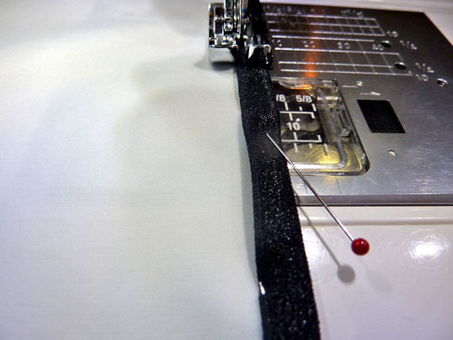 NOTE: We seamed two carded one-yard lengths of FOE by butting them together and securing with a zig zag. From this assembled length, we then cut the two pieces needed. Some fabric stores carry fold over elastic in bulk so you cut get a continuous 1½ yard cut with which to work.