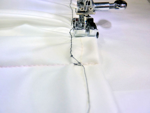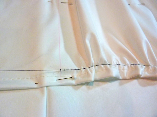 - Pull the pocket’s gathering stitch evenly until the two right edges of the panels align.