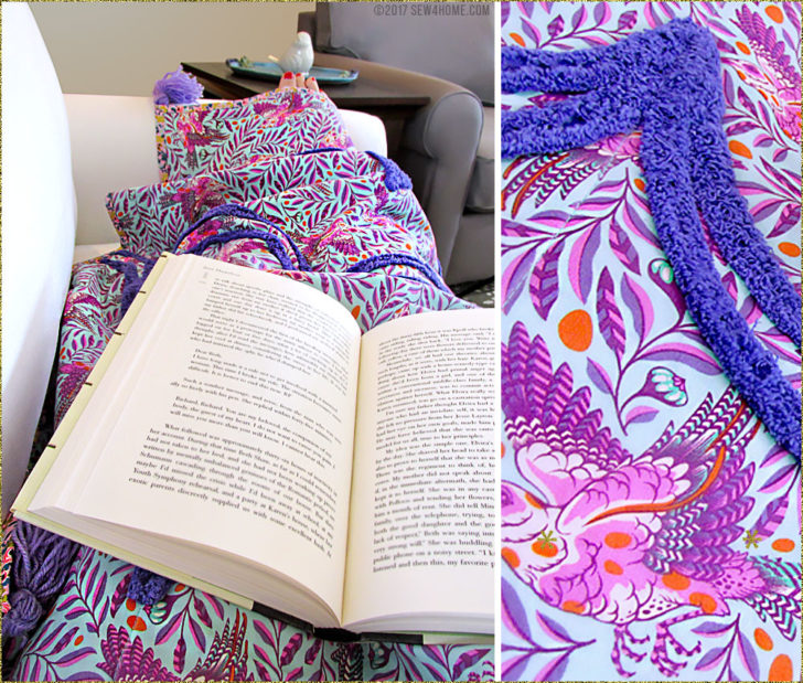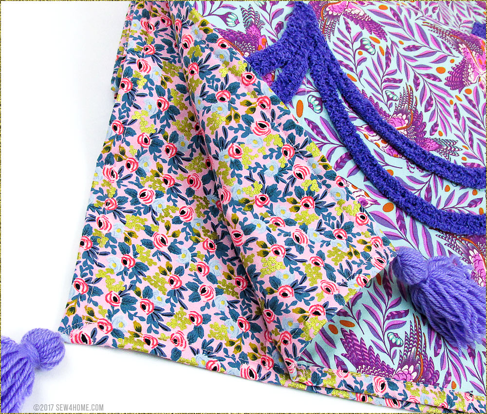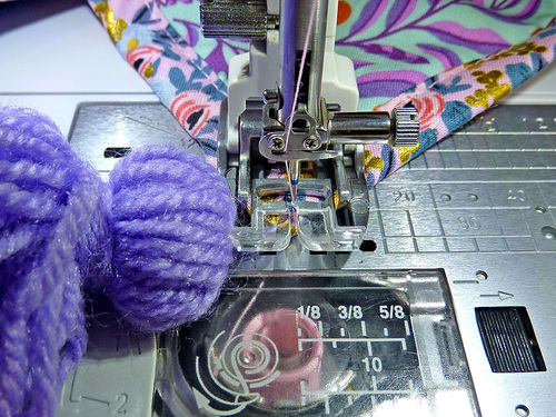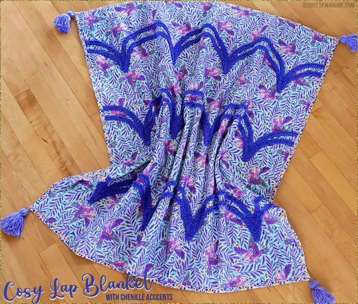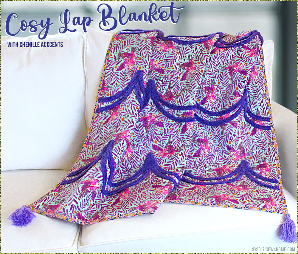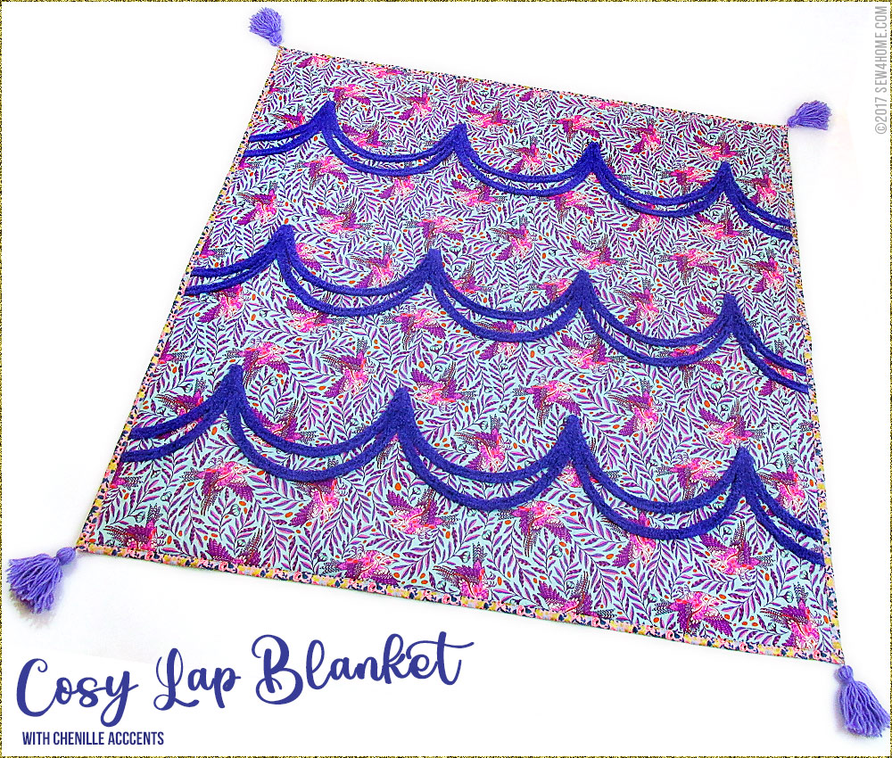 To echo the texture of the chenille, we added a chubby yarn tassel to each corner of our lap blanket. We show you how to insert these prior to edgestitching the wraparound binding into place.