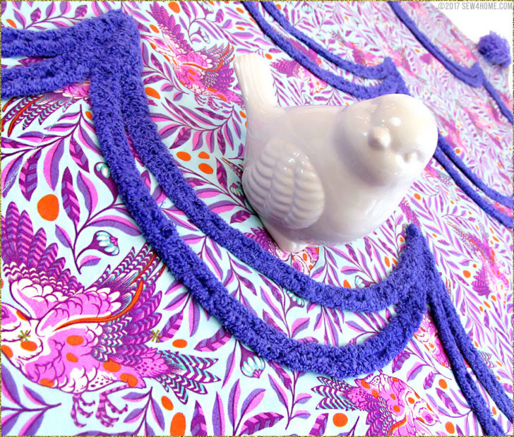 Traditional chenille is created with a soft, feathery yarn and adds a wonderfully fluffy texture and dimension to a project. Or… you can add the look of chenille to your next project with a minimum of prep time on your part, using a specialty cut bias tape. We originally used ⅝” wide Dritz Make Your Own Chenille, which is no longer readily available. The alternative we found is Chenille-It; also 100% cotton fabric and cut on the bias, but ⅜” rather than ⅝”. The result should be very similar.
