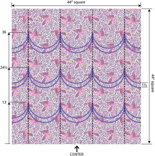 - Repeat to create a row of double scallop markings at 24½” up from the bottom raw edge and at 36” up from the bottom raw edge. The drawing below shows you all the scallop measurements on the full 44” square.