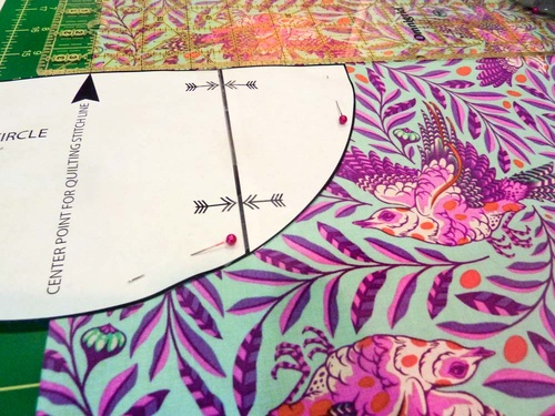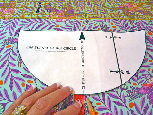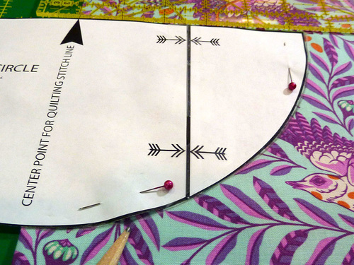 - Find the Scallop Template. Place the center arrow of the Template along the fold. The top straight edge of the Scallop Template should be aligned with the bottom edge of the ruler – in other works, at 13”. Pin the Template in place.