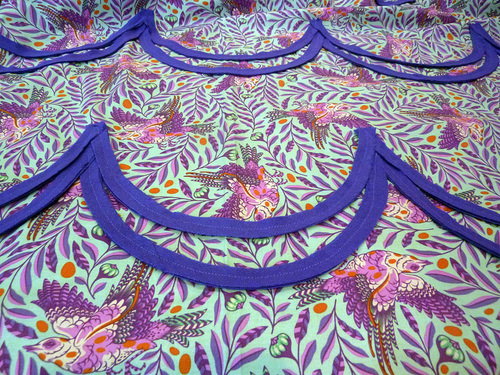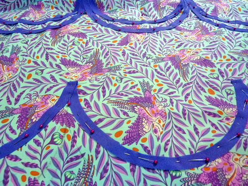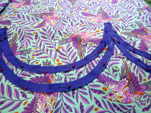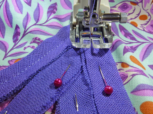 - With three layers pinned in place for your first double row of scallops, move down the panel and repeat to layer and pin for the other two double rows of scallops.