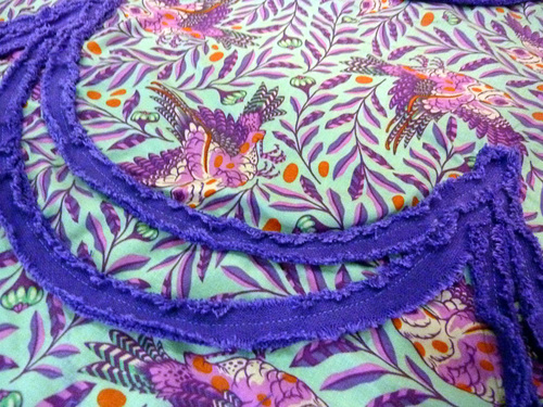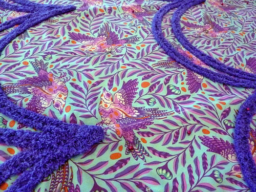 The looser weave of the fabric and its raw edges allow you to stitch it on, then simply wash-fluff-and-dry to create the fuzzy feel of chenille. We added six looping rows of scallops across across a snuggly lap blanket. And here’s your interesting fact for the day: “chenille” comes from the French word for caterpillar.