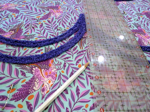 - Follow the scallop line all the way across the panel, pinning in place as you go. Trim the end of the Chenille trim flush with the raw side edge of the panel.