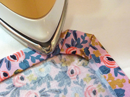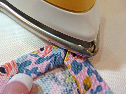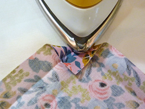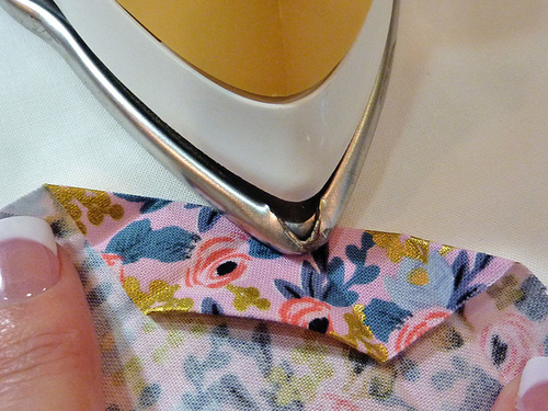- … and then along the opposite side to create the pretty corner point. At each step, press firmly so you will be able to easily see and re-follow all your original folds after layering the front/batting in place.