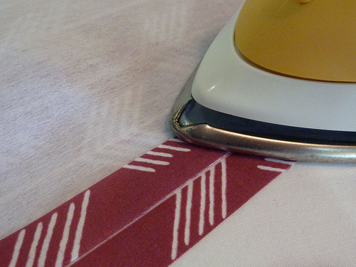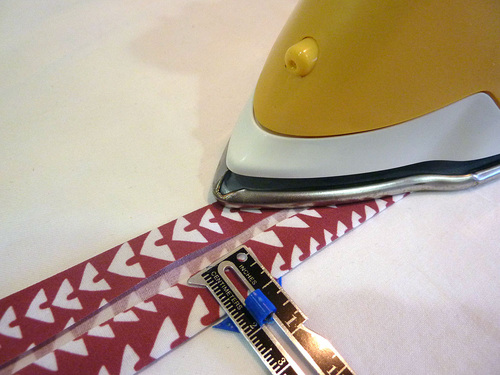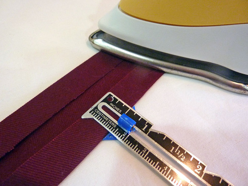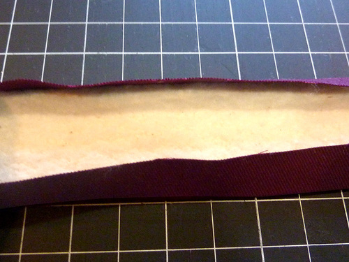 - Fold back each 7″ side of the twill strip ½”. Slip the interfacing strip between the folds, similarly to how you inserted the batting in the main strap assembly. Following manufacturer’s instructions, fuse the interfacing in place.