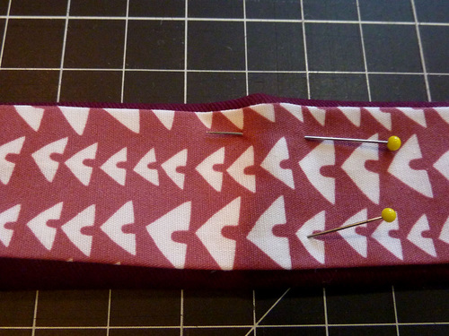 - Form the twill strip into a loop. Place the loop around the center pin point. The raw ends of the loop should be flush with the top raw edge of the exterior panel and the loop itself should be hanging down. Make sure the loop is even; the inside edges should each be ¾” from the center pin point. Pin the loop in place.