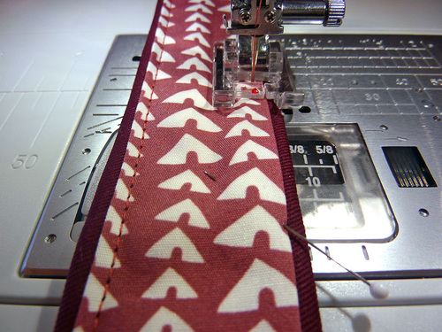 - Edgestitch down both long sides of both layered straps. Your seams should run approximately ⅛” from the folded edges of the feature fabric.