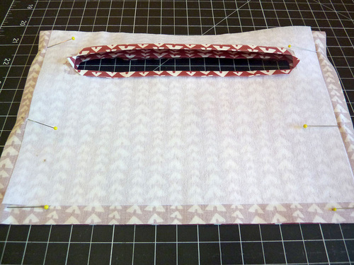 - Place the pocket right side up on the exterior panel. The pocket should be centered side to side and the bottom raw edges of the pocket should be flush with the bottom raw edge of the exterior panel. Lightly pin the pocket in place along its top edge.