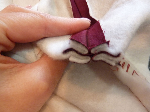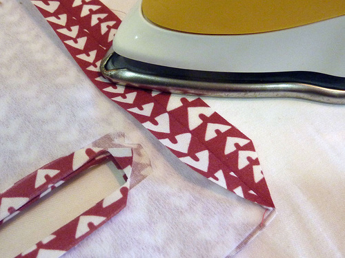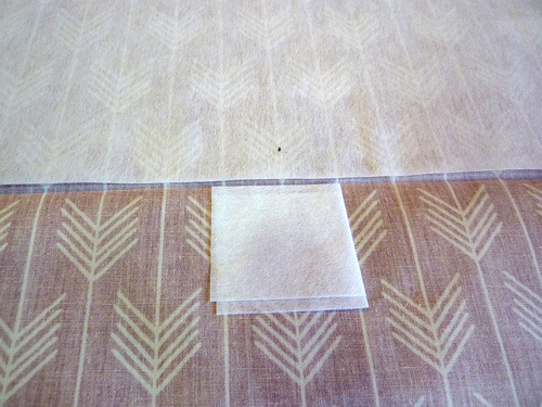 - Directly across from it place two approximately 1½” squares of interfacing. Fuse in place, one on top of the other.