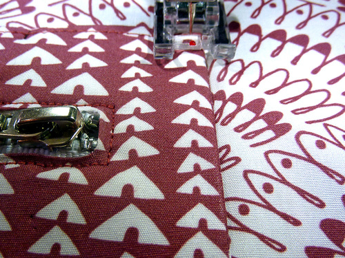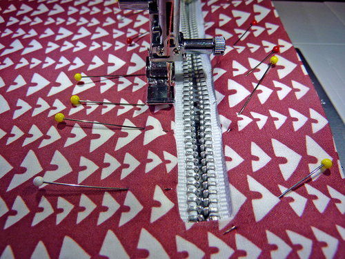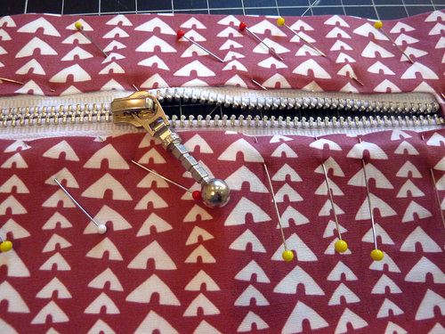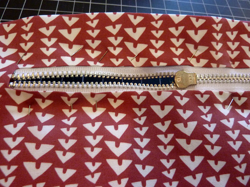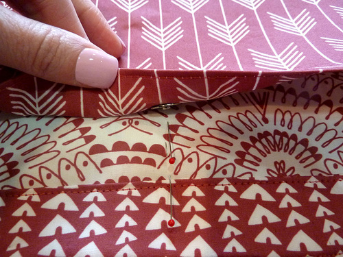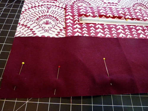 - Re-fold the pocket panel right sides together, carefully re-aligning the zipper windows, and pin along both sides.