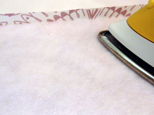 - Unfold the panel wrong side up on your ironing board so the crease line is visible. Place the interfacing panel on the wrong side of the fabric panel, aligning the top edge along the center crease line. There should be ½” of fabric showing beyond the interfacing along both sides and across the bottom. Following manufacturer’s instructions, fuse in place.