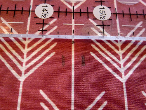 - From the fabric for the lining (Broken Chevrons in our sample), fussy cut TWO 18″ high x 15″ wide rectangles.