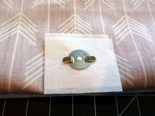 - Using your marks, insert the ball half of the magnetic snap. Remember, you are working through one layer of the flap, inserting through the fused squares of interfacing. If you are new to inserting magnetic snaps, check out our full step-by-step tutorial on this technique.