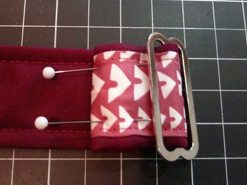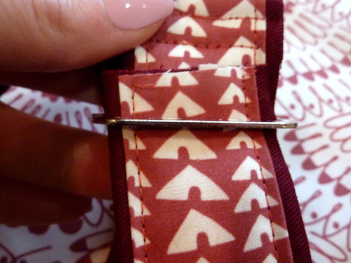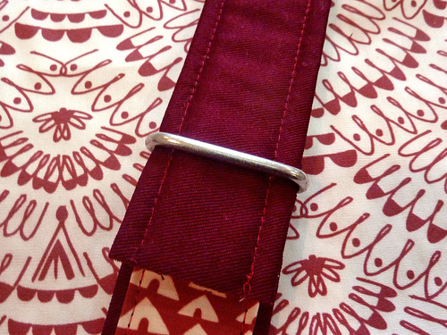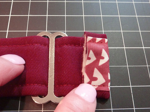 - Pull the strap through so it is again facing right side up and feed the raw end back through the slider, going up and over the end you seamed in place – up and over the center. This creates your adjusting loop.